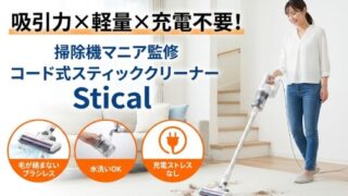コード式なのに軽量、しかも充電不要で吸引力がすごいと話題のスティッククリーナー「Stical」を徹底解説。ブラシレス構造で毛が絡まない、フィルターが大きく水洗い可能でメンテナンスもラク。掃除機マニア高橋歩夢監修の実力やメリット・おすすめな人までわかります。