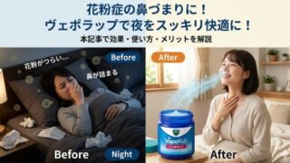花粉症でつらい鼻づまりや呼吸のしづらさに悩んでいませんか?ヴェポラップは花粉症そのものを治す薬ではありませんが、メントールの清涼感で鼻の通りをスッと楽にし、特に夜の睡眠をサポートしてくれます。本記事では効果や正しい使い方、メリットをわかりやすく解説します。
